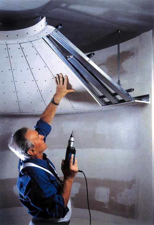 При установке металлического каркаса гипсокартон монтируется в один или два слоя. Одинарная облицовка предполагает одинарный каркаса из металла или дерева. Двойная облицовка может использоваться при двойном или одинарном каркасе из древесины или металла. При облицовке в один слой вес квадратного метра конструкции равен 25 кг. При обшивке двойным слоем вес увеличивается в два раза. Высота перегородки может быть разной, иногда приходится сооружать стену высотой около 6 метров. Необходимо помнить, что при большом поперечном сечении профилей на стойках сокращается шаг установки стоечных элементов. Это позволяет соорудить высокую перегородку или стену.