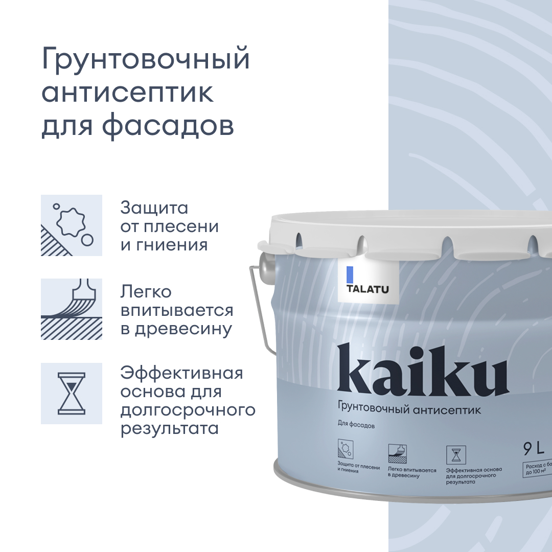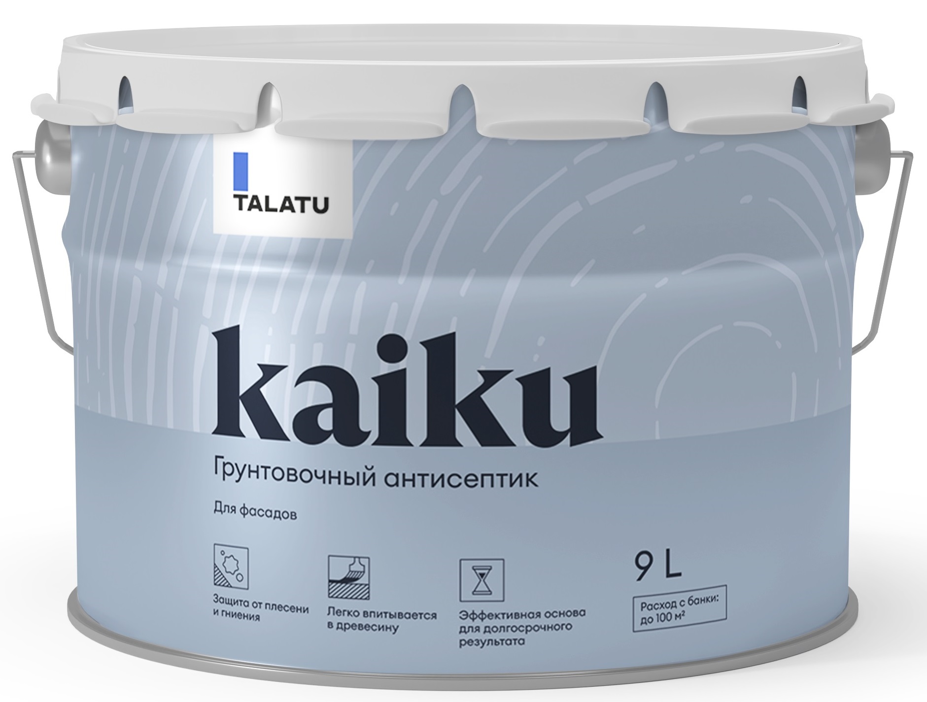 Грунтовочный антисептик Talatu Kaiku предназначен для подготовки деревянных фасадов и конструкций из древесины, находящихся в условиях открытой атмосферы, под окрашивание.