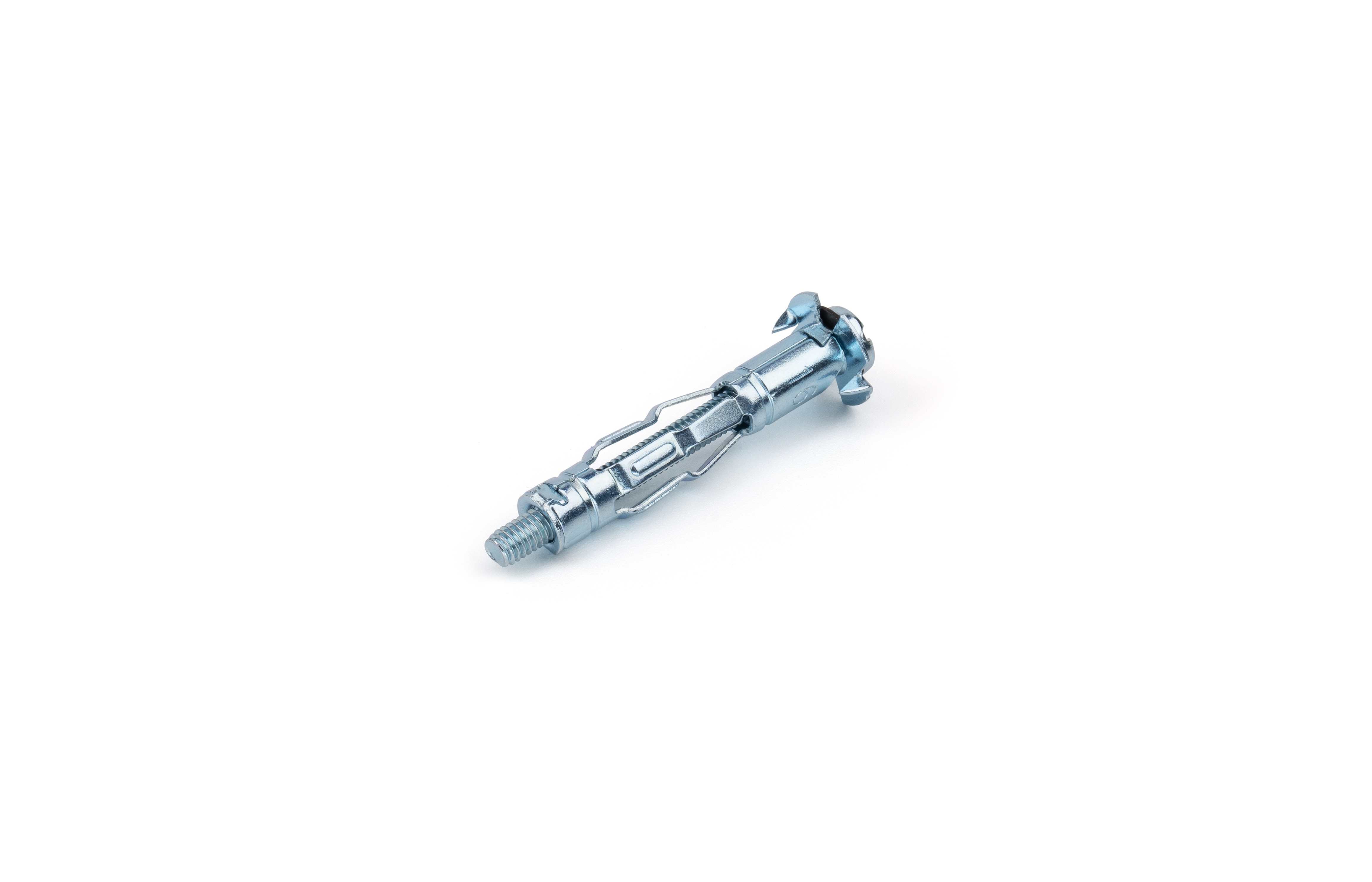 Дюбель изготовлен из оцинкованной стали, что даёт высокую прочность и устойчивость к коррозии. Его конструкция включает опорный бортик с зубцами для дополнительной фиксации в гипсокартоне или аналогичных поверхностях. Распорная часть раскрывается в форме “зонтика” при закручивании винта, что позволяет равномерно распределять нагрузку на внутреннюю поверхность материала.