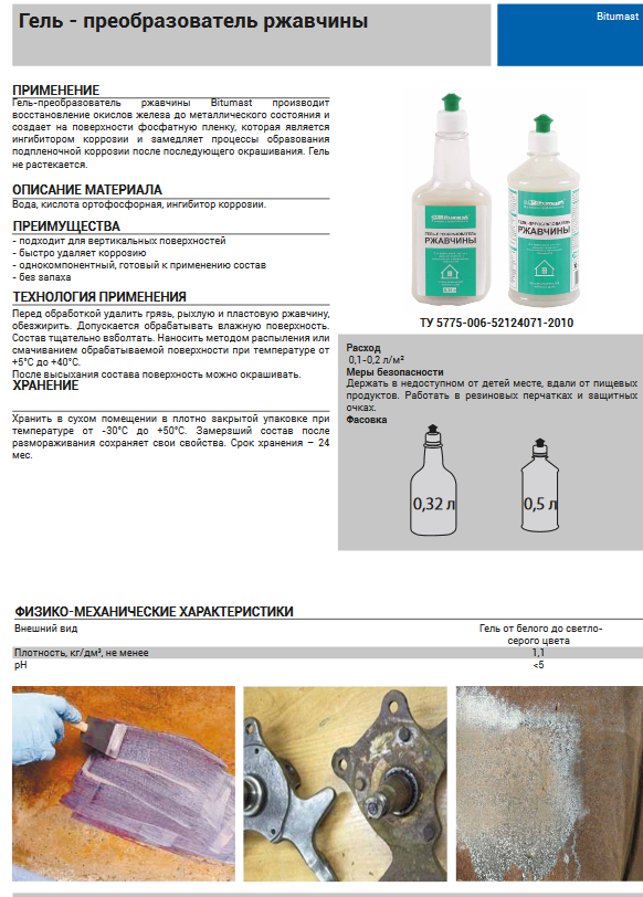 Гель-преобразователь ржавчины Bitumast производит восстановление окислов железа до металлического состояния и создает на поверхности фосфатную пленку, которая является