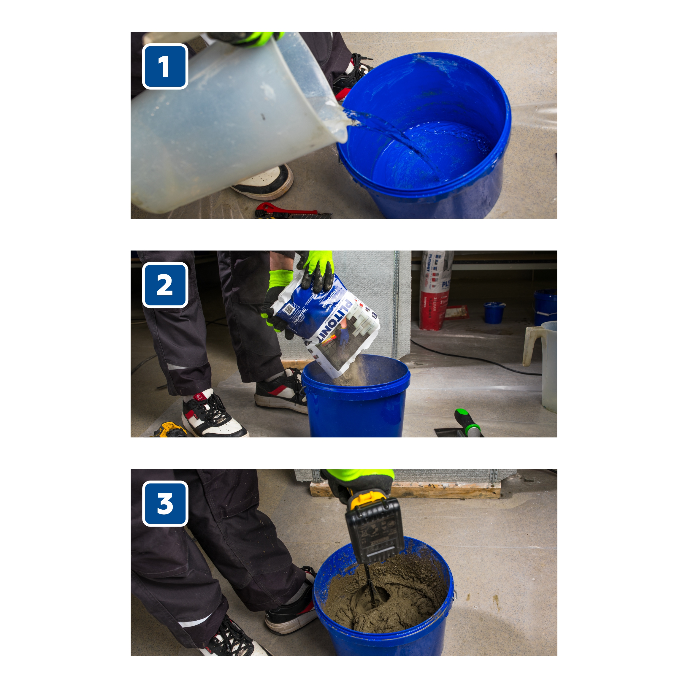 - Засыпьте сухую смесь в ёмкость с водой и перемешивайте 2-3 минуты с помощью электромиксера или электродрели с насадкой, соблюдайте частоту вращения не более 600 об/мин – до получения однородной консистенции