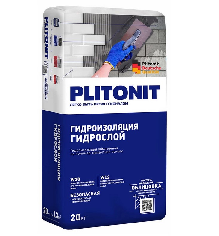 Гидроизоляция Плитонит ГидроСлой (ГидроСтена) на цементной основе 20 кг – строительная смесь на цементной основе, предназначенная для гидроизоляционной защиты и ремонта вертикальных и горизонтальных конструкций при внутренних и наружных работах. Используется для обработки бетона, железобетона, кирпича. Гидроизоляция Плитонит ГидроСлой образует жесткое покрытие и защищает конструкции от пагубного воздействия дождевых вод, препятствует фильтрации влаги через конструкцию в случае ее нахождения в воде. Рекомендуется использовать гидроизоляцию Плитонит ГидроСлой для защиты подвальных помещений, цокольных этажей, бассейнов, ванных комнат, отмосток, фундамента и для прочих помещений, не подвергающихся деформационным нагрузкам.