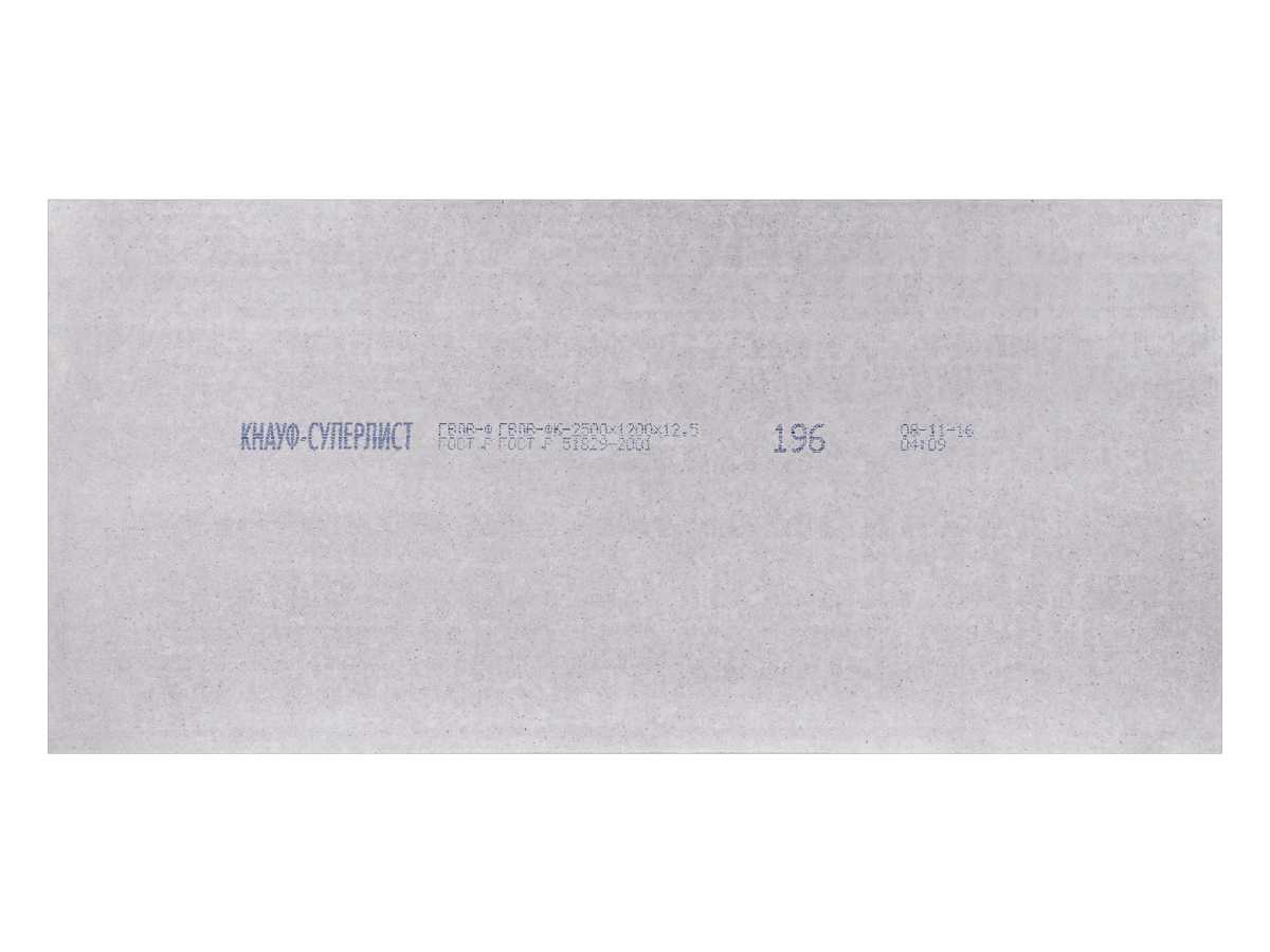 Гипсоволокнистый лист влагостойкий КНАУФ ГВЛВ 12,5 х 1200 х 2500 мм ФК -КНАУФ-суперлист - высококачественная экологически чистая разновидность гипсоволокнистых листов. Предназначен для строительных отделочных работ сухим способом. Производится ООО "КНАУФ ГИПС Дзержинск" и ОАО "КНАУФ ГИПС Челябинск" по ГОСТ Р 51829-2001 прессованием смеси гипсового вяжущего и волокон распушенной макулатуры, равномерно распределенных по всему объему листа.