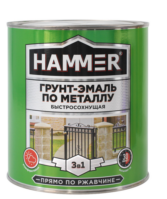 Грунт-Эмаль по металлу Хаммер, предназначена для защиты и создания декоративного покрытия на стальных и чугунных поверхностях с остатками оскалины и плотно державшейся ржавчины, подвергающихся воздействию атмосферы, солей и других химических реагентов.