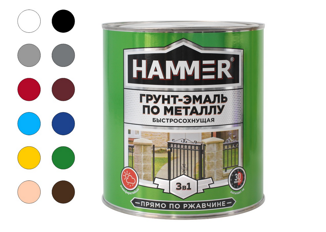 Грунт-Эмаль по металлу Хаммер, предназначена для защиты и создания декоративного покрытия на стальных и чугунных поверхностях с остатками оскалины и плотно державшейся ржавчины, подвергающихся воздействию атмосферы, солей и других химических реагентов.