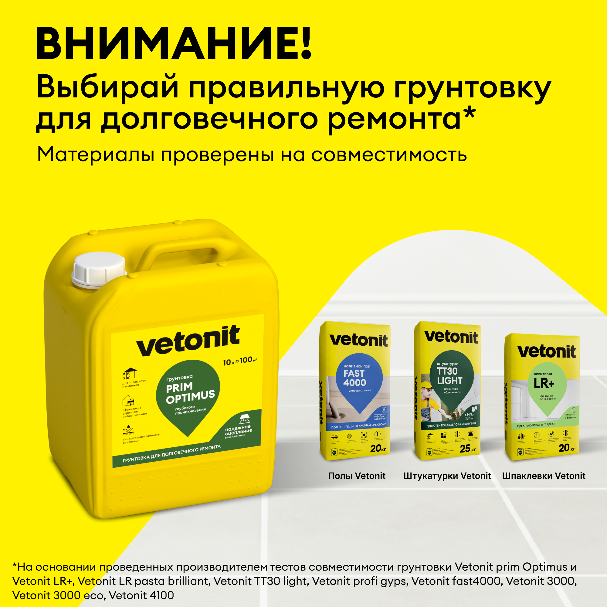 Ветонит Prim Optimus 10л – грунтовка глубокого проникновения для качественной подготовки стен, потолков и полов под последующее оштукатуривание, шпаклевание, окрашивание, оклейку обоями, приклеивание плитки, нанесение полимерной гидроизоляции, ровнителей и наливных полов. Для подготовки оснований при устройстве фасадных систем теплоизоляции Vetonit, перед нанесением минеральных декоративных штукатурок и окраской акриловыми, силиконовыми и силикатными красками. Укрепляет поверхность, связывает пыль и снижает впитывающую способность основания. Для наружных и внутренних работ.