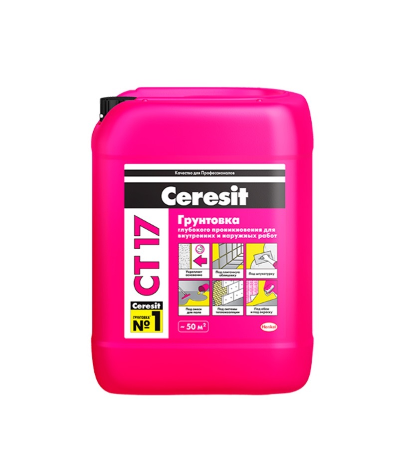 Ceresit CT 17 зимняя – грунтовка глубокого проникновения, предназначена для обработки поверхностей перед нанесением штукатурных и напольных смесей, плиточных клеев и т.д. Подобная обработка необходима для обеспечения надежного сцепления верхних (кроющих) слоев покрытия с впитывающими основаниями. В состав грунтовки Ceresit СТ 17 входит водная дисперсия сополимеров акрилатов.