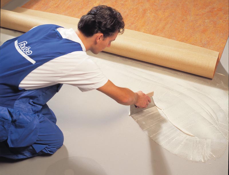 Перемешать клей и нанести мелким зубчатым шпателем на основание. На впитывающее влагу основание приклеивание производится т.н. методом "мокрого" приклеивания. Напольное покрытие прижимается к основанию сразу после нанесения клея и тщательно притирается до схватывания. Если облицовка является жёсткой или её нужно из-за конструкции изгибать, дать клею подсохнуть 10-30 мин до укладки облицовки.
