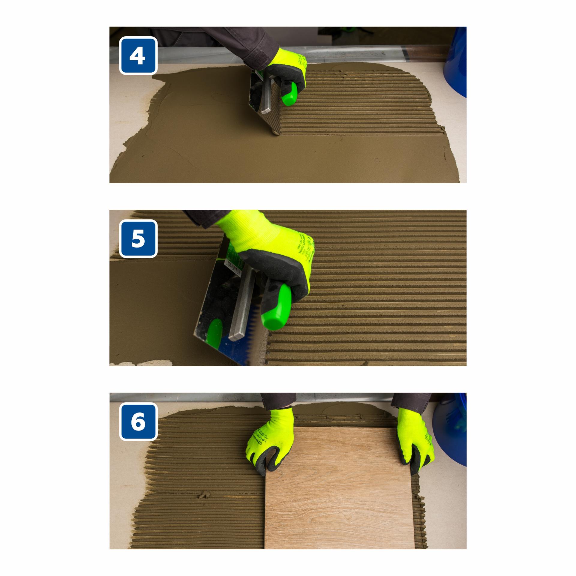На тыльную сторону плитки нанесите клей зубчатым шпателем, затем равномерно разравняйте гладким шпателем по всей площади плитки. При монтаже притки комбинированным способом расход смеси увеличивается на 1,3 кг/м2, при толщине слоя 1 мм.