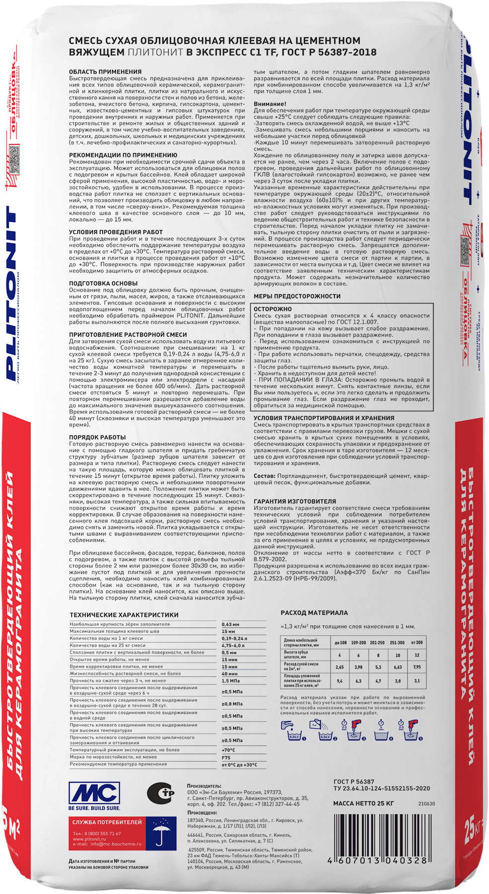 Плиточный клей компании Плитонит - отличный клей для керамогранита и всего остального. Быстротвердеющий класс. Разводится быстро и без комков даже шпателем, супер-пластичен, можно, работать одно удовольствие. Будем заказывать еще, и спасибо Материк за быструю доставку.