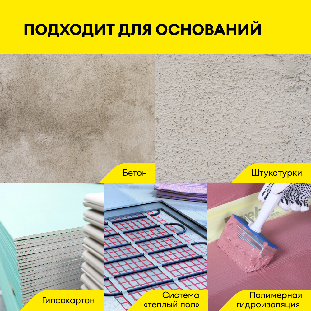 - Укладка плитки на гипсокартонные, гипсоволокнистые листы, а также бетон (старше 6-ти месяцев), ячеистый бетон, кирпич, стяжки (в том числе с системой «Теплый пол»), штукатурки и шпаклевки на цементной, цементно-известковой основе, поверхности, обработанные полимерной гидроизоляцией weber.tec 822, цементной гидроизоляцией weber.tec 93.