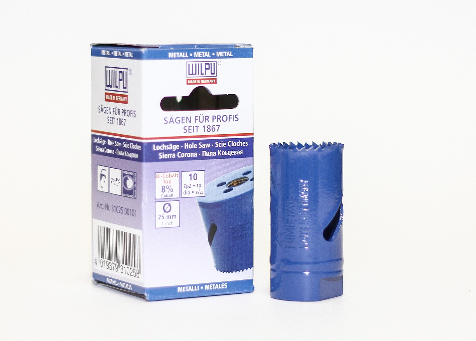 Зубья коронки изготовлены из быстрорежущей стали с содержанием 8% кобальта, имеют особую заточку, что дает усиленный захват материала и обеспечивает оптимальный отвод продуктов пиления. Комбинированные, фрезерованные и разведены зубья 10шт. на дюйм.