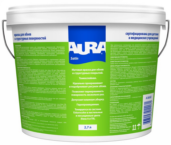 Аура Сатин - хорошая водная краска для обоев. Искал краску хорошего качества, недорогую, которую можно использовать для покраски стен в детской. После нанесения обои сохраняют свою текстуру и рисунок, что очень здорово. Полученным результатом очень доволен! Покупал в Материке, привезли быстро.