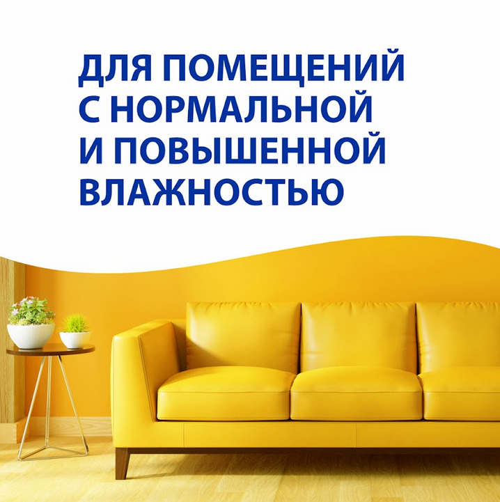 Матовая влагостойкая краска для стен и потолков внутри помещений с нормальной и повышенной влажностью, а также с возможными колебаниями влажности. Применяется по ранее неокрашенным или окрашенным водно- дисперсионными красками поверхностям: гипсокартону, бетону, газобетону, асбоцементу, штукатуркам, шпатлевкам, кирпичной кладке, ДВП, ДСП, а также по поверхностям, оклеенным различными рулонными отделочными материалами. Сертифицирована для детских и медицинских учреждений. Белый – можно использовать без колеровки