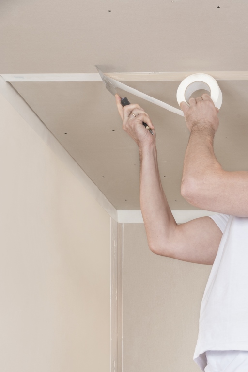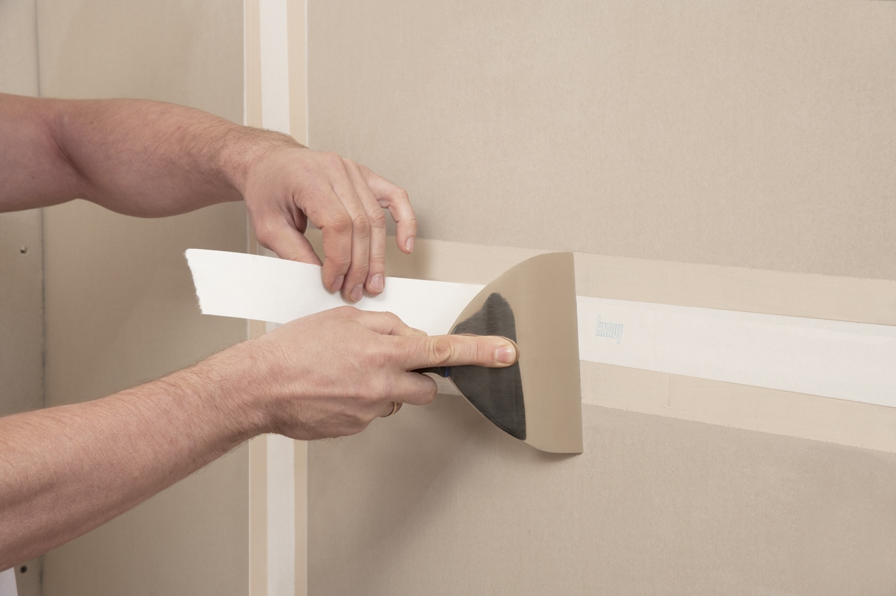 - Прошпаклюйте стык (или угол) в уровень с КНАУФ-листом