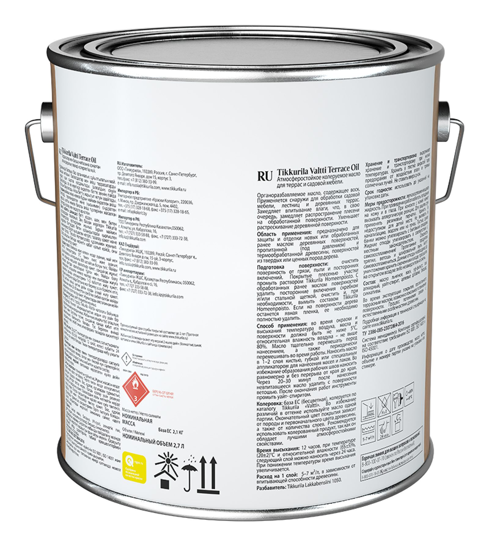 Цвет: бесцветный, колеруется по каталогу Tikkurila «Valtti». Во избежание различий в оттенке используйте масло одной партии. Окончательный цвет покрытия зависит от породы и первоначального цвета древесины, а также от количества слоев.
