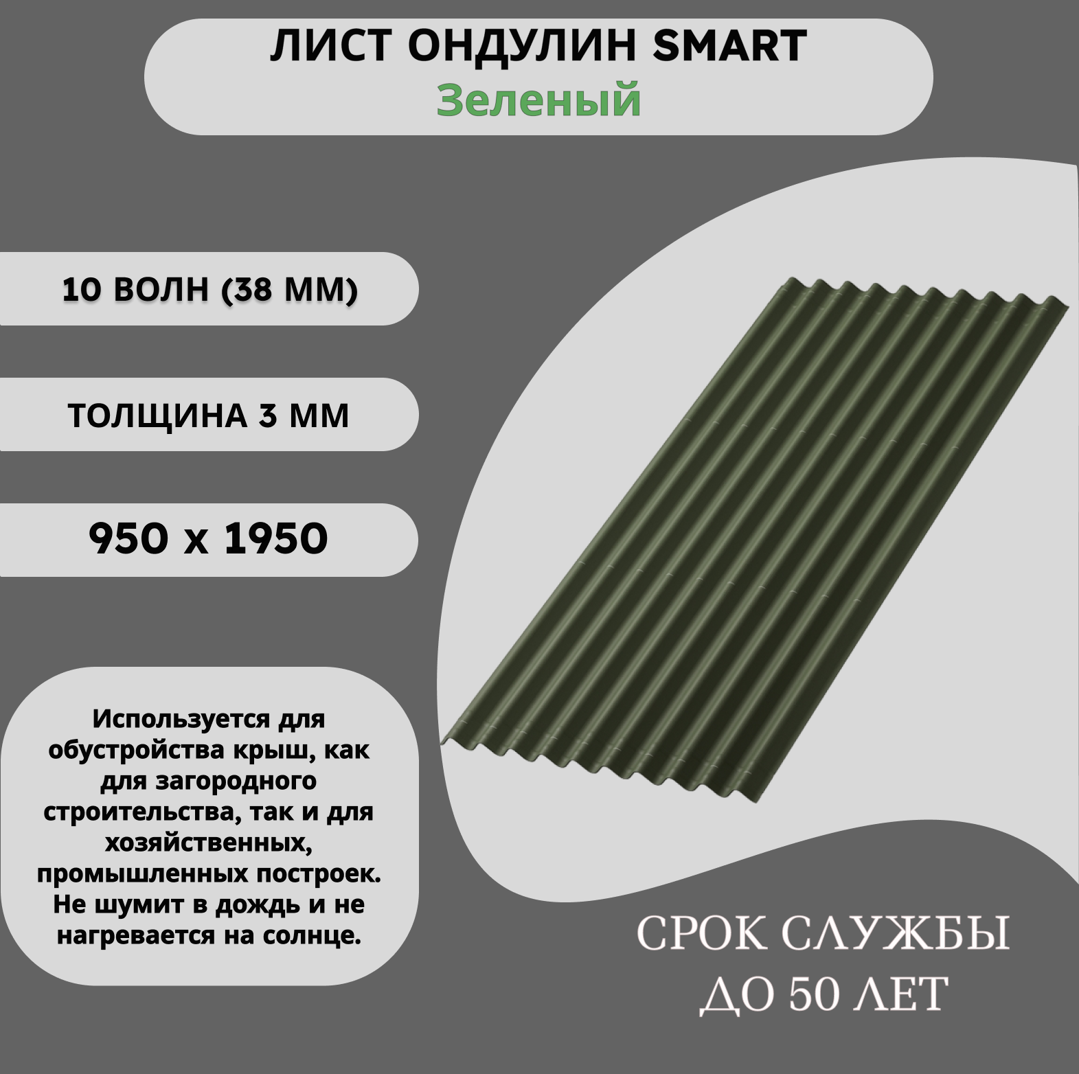 Ондулин Смарт зеленый – кровельное покрытие, которое представляет собой битумные волнистые листы. Используется для обустройства крыш, как для загородного строительства, так и для хозяйственных, промышленных построек.