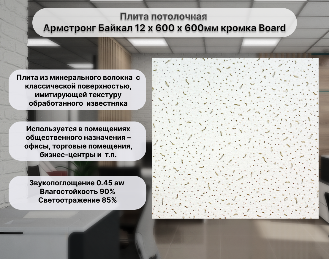 Потолочная плита Армстронг Байкал предназначена для устройства подвесного потолка в помещениях общественного назначения – офисы, торговые помещения, бизнес-центры и т.п.