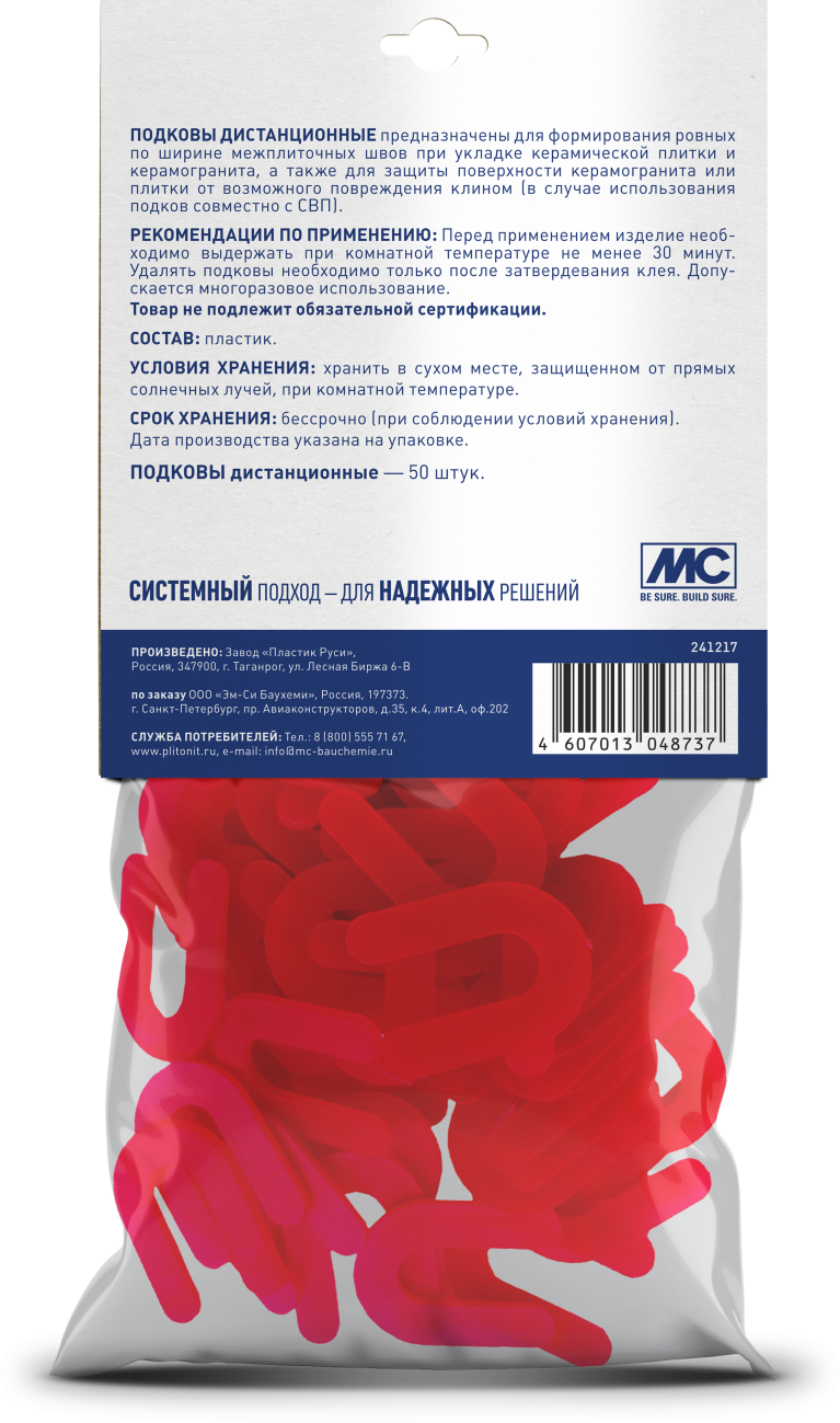 Преимущества и выгоды применения : Порядок работы Перед применением изделие необходимо выдержать при комнатной температуре не менее 30 минут. На одну грань плитки необходимо использовать не менее двух подков. Удалять подковы необходимо только после затвердевания клея. Допускается многоразовое использование подков. Состав: пластик Условия хранения: Хранить в сухом месте, защищенном от прямых солнечных лучей, при комнатной температуре. Рекомендуемый срок хранения- не ограничен (при соблюдении условий хранения).