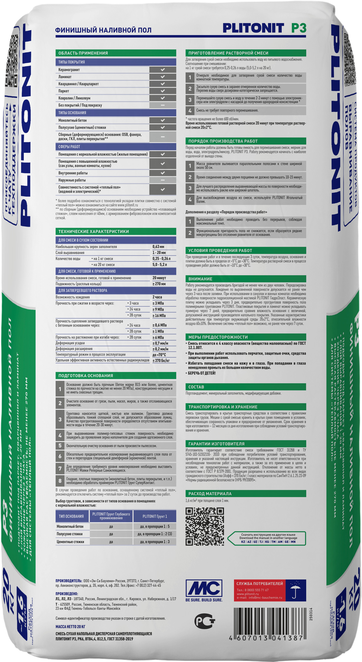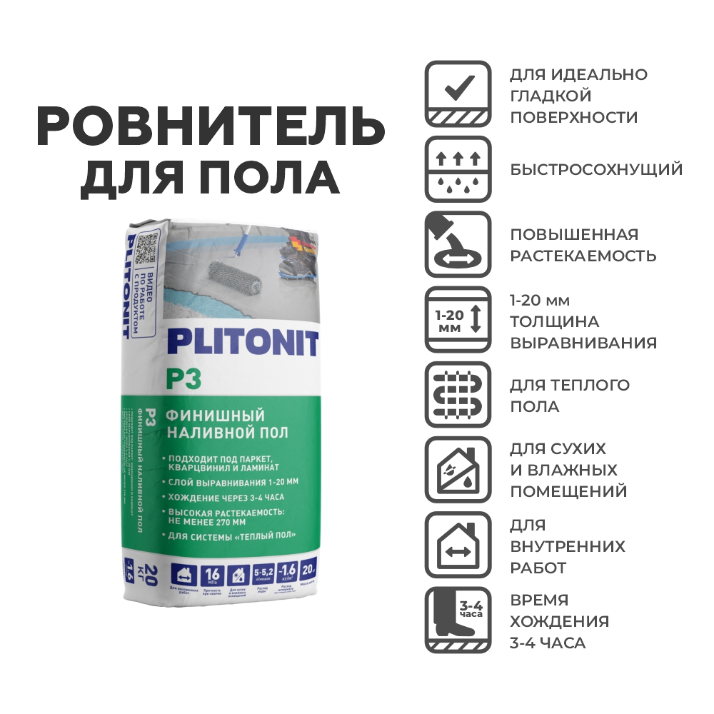 Ровнитель Плитонит Р3 для пола быстротвердеющий самовыравнивающийся 1-20мм 20кг – сухая строительная смесь, применяемая для предварительного выравнивания бетонных полов и монолитных цементных стяжек под укладку напольных покрытий. Используется для выравнивания полов под укладку напольной керамической плитки, выстилающих покрытий и паркета при внутренних работах в помещениях с нормальной нагрузкой – в жилых помещениях, в офисах. Также допускается использование ровнителя ПЛИТОНИТ Р3 в системе «теплый пол».