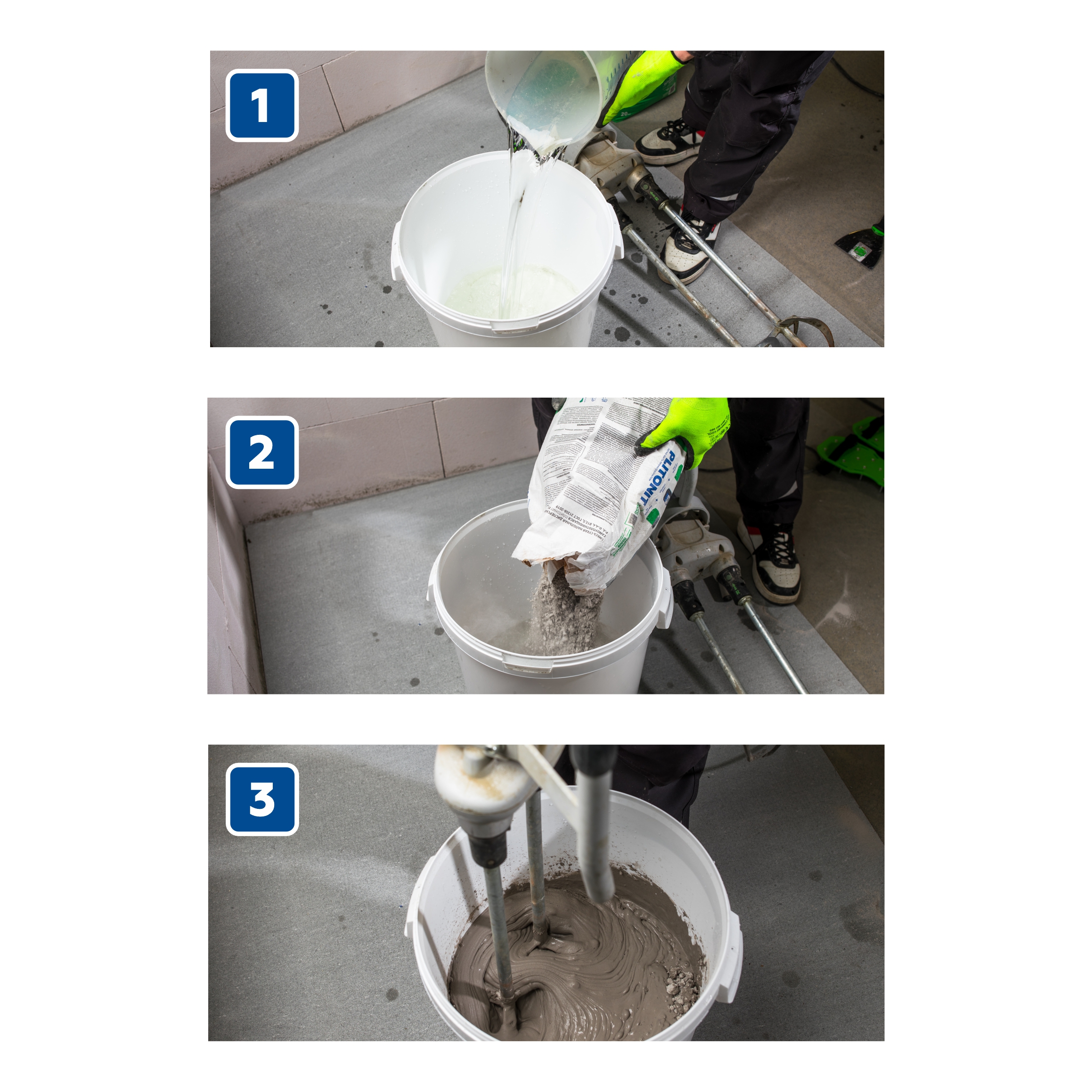 Используйте чистую воду комнатной температуры. При смешивании соблюдайте пропорцию: 0,25-0,26 л воды на 1 кг сухой смеси. В заранее приготовленную емкость с водой засыпьте сухую смесь и перемешивайте в течение 3 минут с помощью электромиксера или электродрели с насадкой, соблюдая частоту вращения на уровне –не более 600 об/мин до получения однородной консистенции.