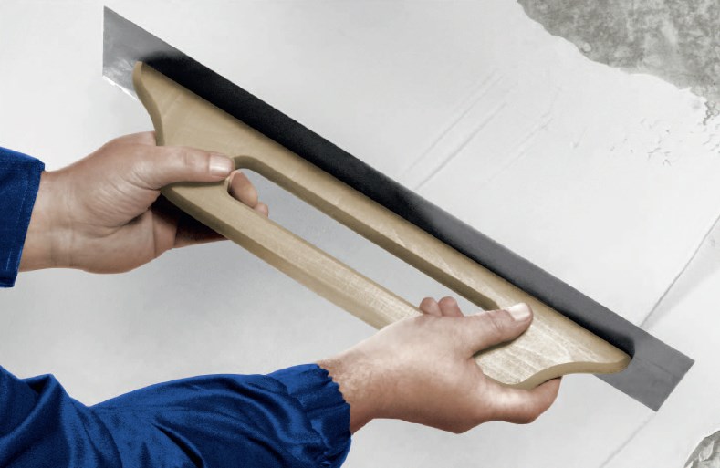 На подготовленную поверхность основания нанести широким металлическим шпателем раствор шпаклёвки толщиной слоя 1-3 мм и загладить.