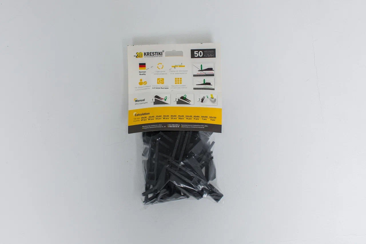 Система выравнивания плитки клин 3D Крестики черный 50 шт/уп – является частью системы выравнивания плитки (СВП), состоящей из зажима и клина. Благодаря использованию клиньев легко добиться идеально ровных швов шириной от 0.8 до 2 мм.