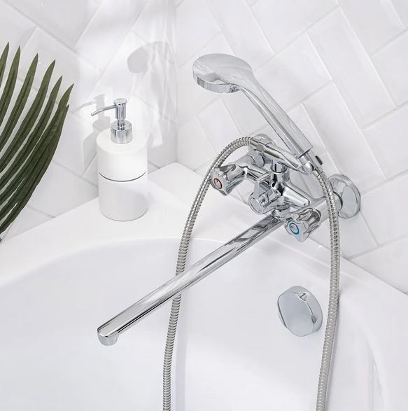 - Длина излива — 350 мм с поворотным механизмом, что обеспечивает удобство использования и возможность направлять водяной поток в разные стороны;