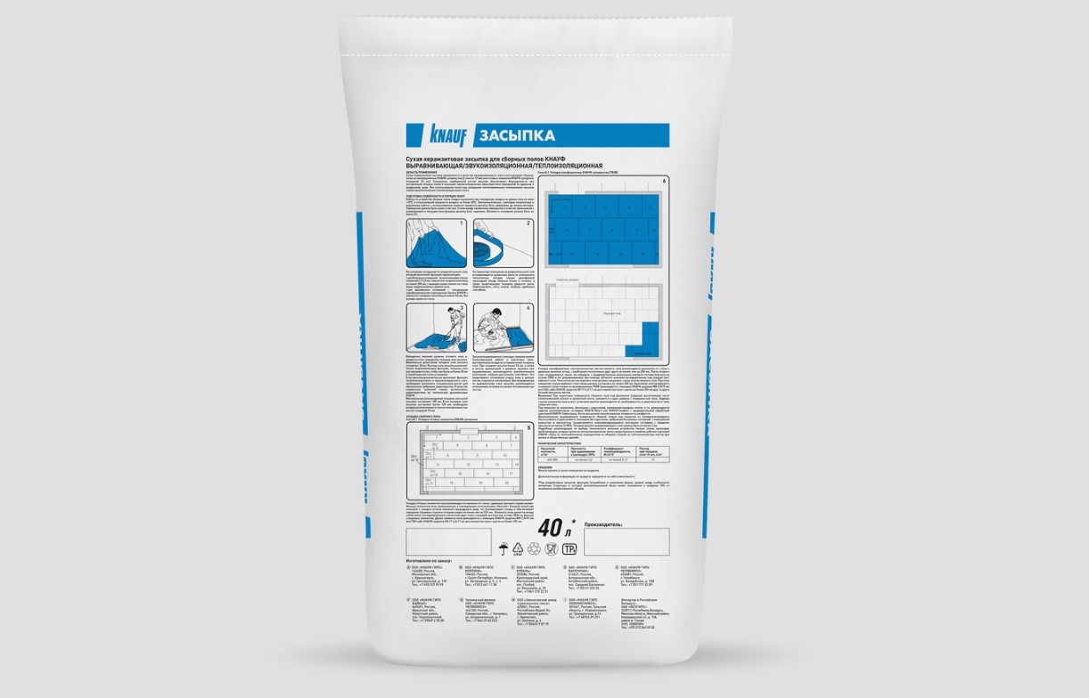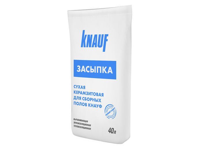 Сухая засыпка КНАУФ - применяется для выравнивания, звуко- и теплоизоляции оснований, с последующим устройством сборных оснований из КНАУФ-суперпола и КНАУФ-суперлистов влагостойких (ГВЛВ).