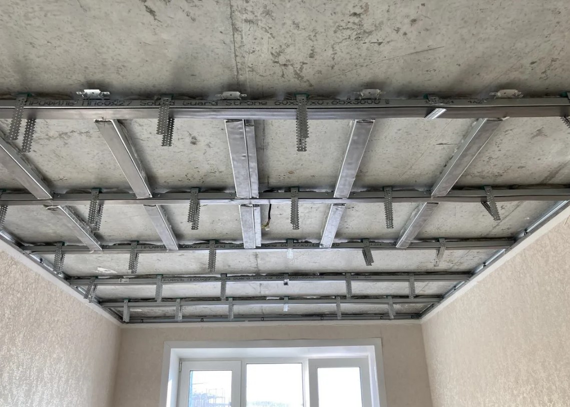 Важно: Монтировать одноуровневый или двухуровневый металлический каркас на потолке необходимо строго по технологии возведения данных конструкций. Подвесы необходимо устанавливать с одинаковым шагом, сетка каркаса должна получится 600*400мм, после чего обязательно извлечь все крепления направляющих профилей.