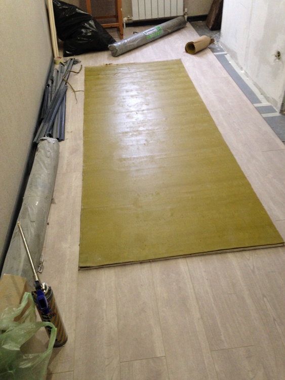 Монтаж под сухую стяжку: мембрану раскатывают с нахлёстом в 5 см на стены, нахлёсты между продольных слоев, дополнительная фиксация не требуется.